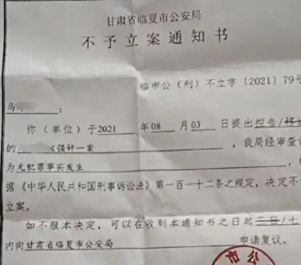 2021年,临夏12岁4个月的女孩小燕(化名),因轻信网友马某华"去公园游玩"的邀约,独自离家前往市区赴约,此后便与家人失去了联系。在失联的整整三天里,小燕先后遭遇马某华、司某云、马某云三人的多次性侵,待三人离开后,又被周某洒搭讪纠缠,再次遭受侵害。焦急万分的叔叔马建强(化名)与奶奶四处寻找,最终在市区寻回了身心俱疲的小燕。得知侄女的遭遇后,家人第一时间报警,警方迅速控制了三名涉案人员,并带小燕前往医院检查。然而令人费解的是,案发仅三天,临夏市公安局便出具了《不予立案通知书》,以"无犯罪事实发生"为由拒绝立案。