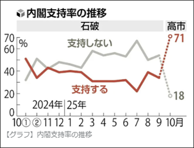 具体来看,表示"支持"高市内阁的受访者占71%,表示"不支持"的仅占18%。与上月石破内阁34%的支持率相比,大幅上升了37个百分点。