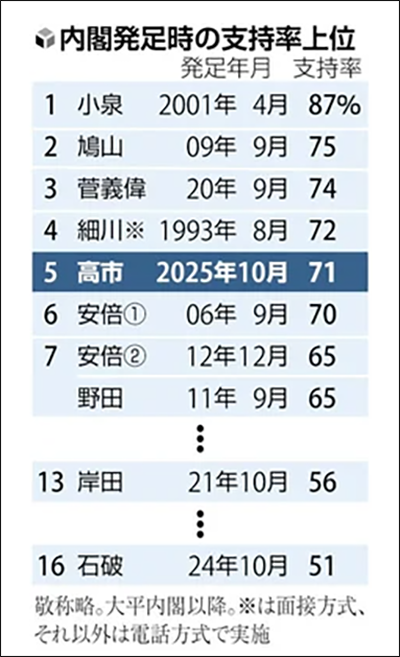 当地时间10月22日,据日本《读卖新闻》公布的紧急民意调查显示,高市新内阁的支持率达到71%,在日本历届新内阁成立时的支持率中位列第5。远超石破内阁与岸田内阁成立之初的50.7%和55.7%,不支持率仅为18%。