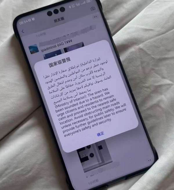 滞留巴林的华人在手机上收到空袭警报。受访者供图