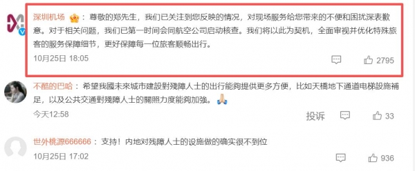 "深圳机场已经对我个人提出道歉,我也不再追究此事,只是希望机场能借由此事做出整改,优化对残疾人的服务和协助"。