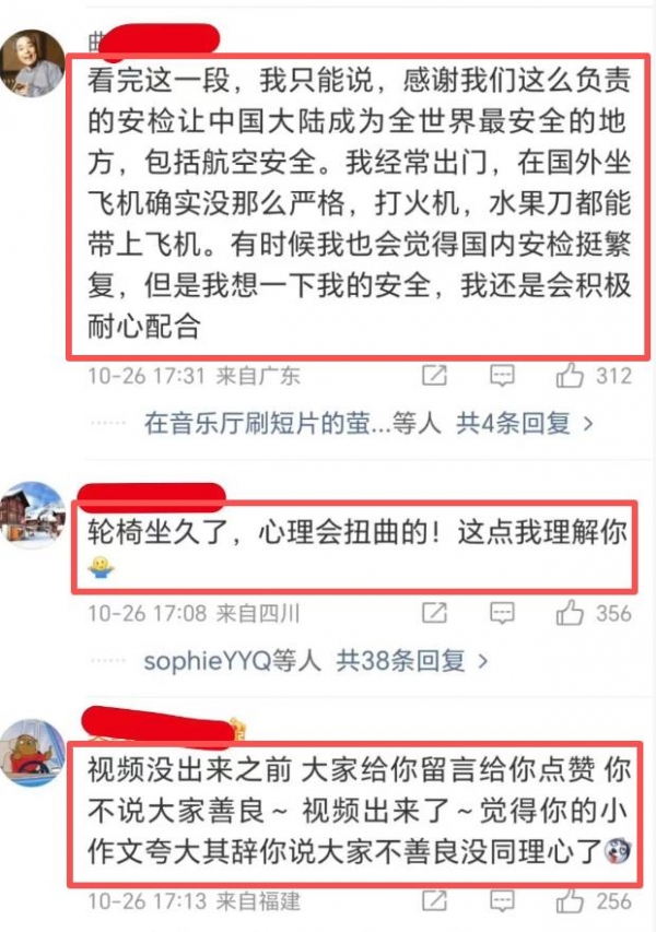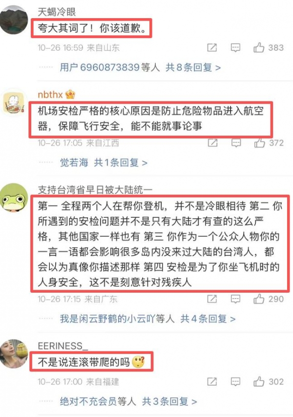 也有网友说,"可能机场对残疾人的保障不够完善,但这和你撒谎完全是两码事,你该道歉"。