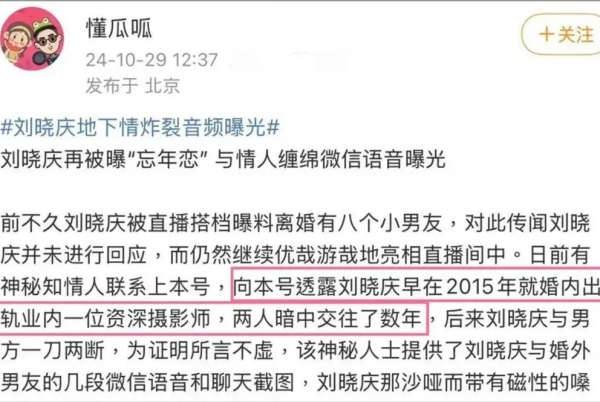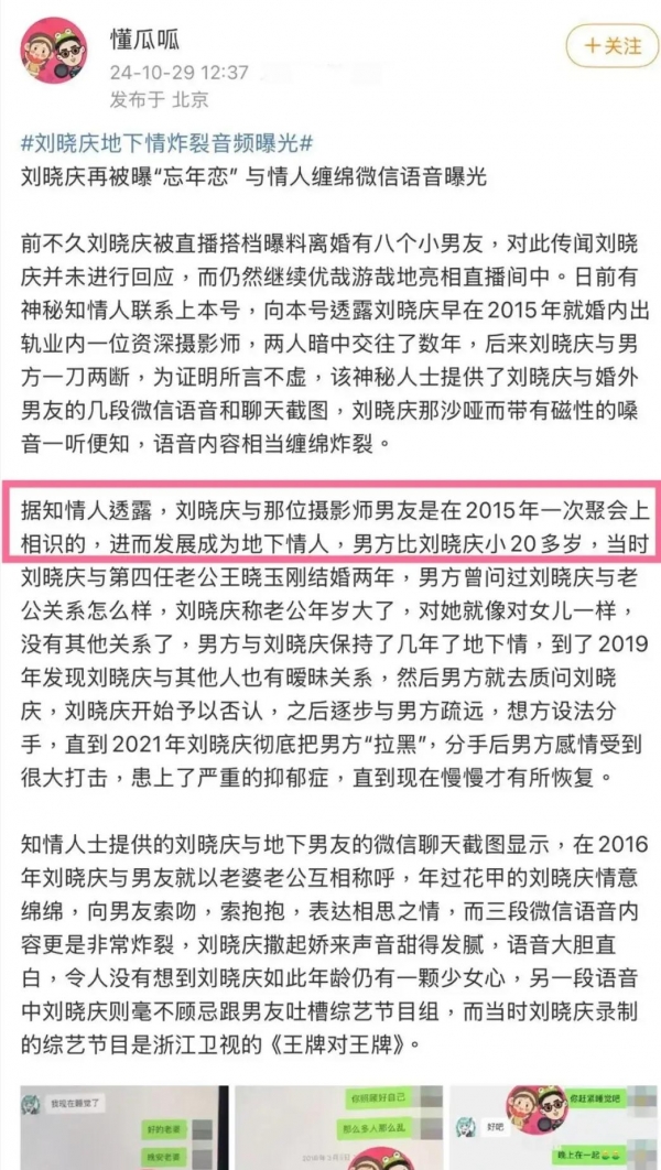 此前,就有网友爆料刘晓庆同时交往八个男朋友,然而近日又有八卦博主爆料刘晓庆曾经在"婚内出轨",甚至还爆出有些让人"羞耻"的聊天记录。