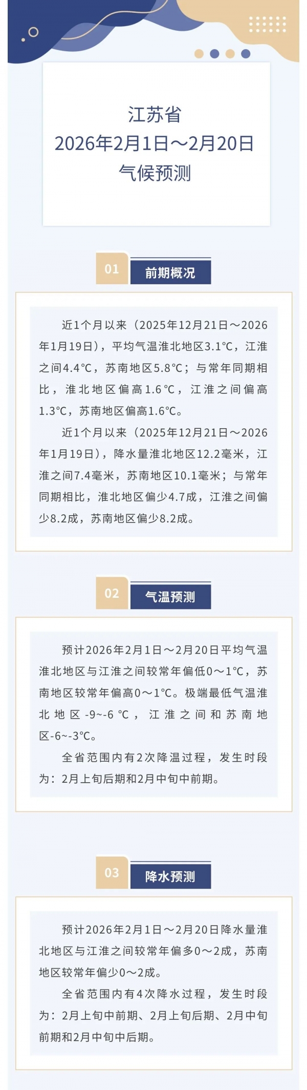 全省范围内有2次降温过程,发生时段为:2月上旬后期和2月中旬中前期。预计2026年2月1日~2月20日降水量淮北地区与江淮之间较常年偏多0~2成,苏南地区较常年偏少0~2成。
