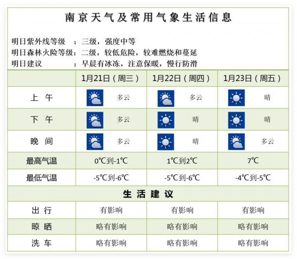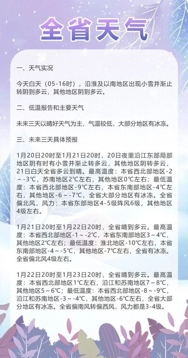 1月20日20时至1月21日20时,20日夜里沿江东部局部地区阴有时有小雪并渐止转多云,其他地区阴转多云,21日白天全省多云到晴。最高温度:本省西北部地区-2~-3℃,苏南地区2℃左右,其他地区0℃左右;最低温度:本省西北部地区-9℃左右,本省东南部地区-4℃左右,其他地区-6~-7℃,全省大部分地区有冰冻。全省偏北风,风力:本省东部地区4-5级阵风6级,其他地区4级左右。
