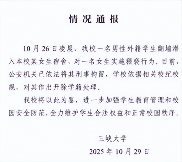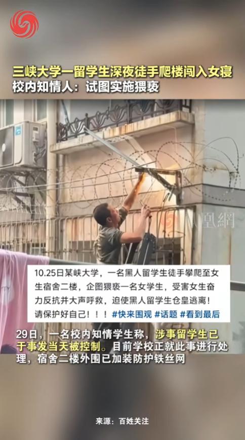 实在是太可怕了!10 月 26 日,三峡大学南苑女生公寓的学生们不会想到,徒手攀爬上二楼的不是检修人员,竟是一名外籍留学生 -- 他翻窗闯入宿舍触摸女生头部,在反抗中打伤对方脸部,直到女生呼救才仓皇逃离。这场惊魂夜,让 "校园安全" 再次成为无法回避的焦点。