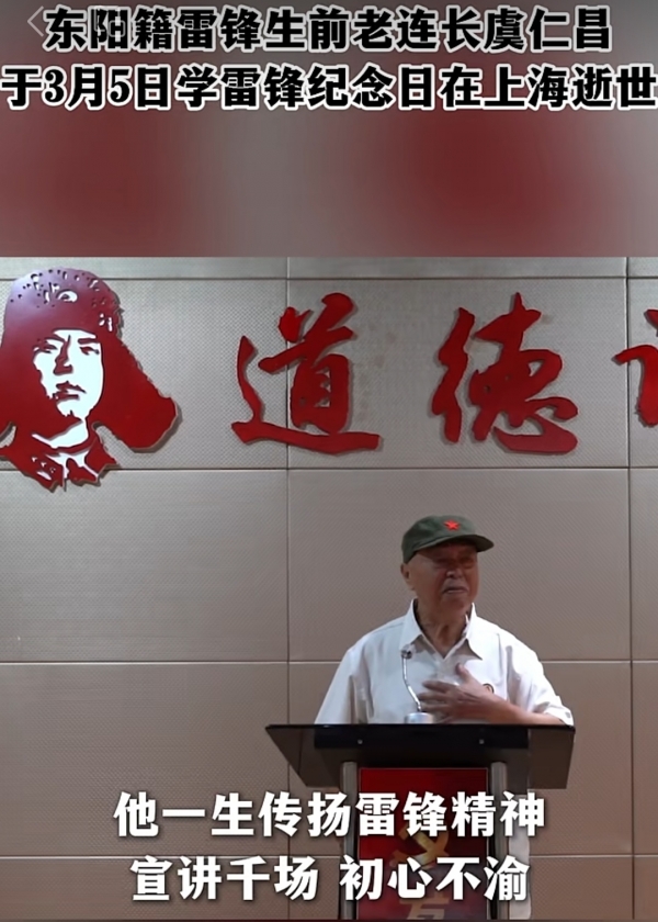 雷锋生前老连长、东阳籍抗美援朝老兵虞仁昌,于3月5日21时25分在上海逝世,享年97岁。这一天正好是第63个学雷锋纪念日,老人在这个特殊的日子里,仿佛是去赴一场跨越半个多世纪的约会,与他牵挂一生的战士"重逢"。