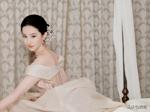 露肩设计勾勒优美肩颈线,发型上点缀繁花发饰,增添柔美氛围,搭配红宝石珠宝,华丽又不失格调,整体呈现出高贵典雅、仙气十足的气质,宛如从宫廷画卷走出的公主 。