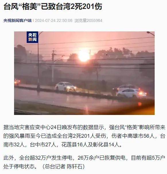 台风"格美"已致台湾2死201伤