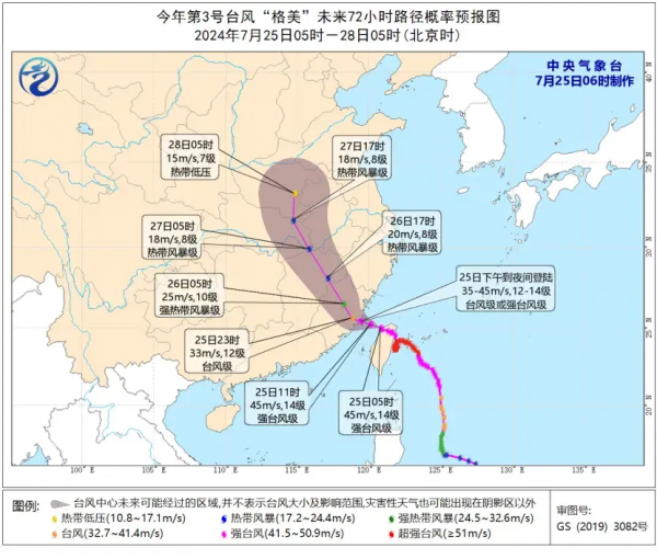 大风预报:7月25日08时至26日08时,黄海南部、东海大部、巴士海峡、南海大部、华东和华南沿海、长江口区、杭州湾将有7-8级大风,其中东海南部及钓鱼岛附近海域、台湾海峡、台湾以东洋面、台湾岛沿海、福建沿海、浙江东南部沿海的风力有9-12级,"格美"中心经过的附近海面或地区的风力有13-14级,阵风15-16级。