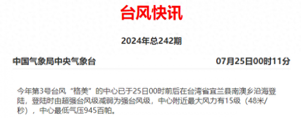 今年第3号台风"格美"的中心已于今天(25日)00时前后在台湾省宜兰县南澳乡沿海登陆,登陆时由超强台风级减弱为强台风级,中心附近最大风力有15级(48米/秒),中心最低气压945百帕。台风"格美"的中心今天早晨5点钟位于我国福建省福州市平潭县东南方大约110公里的台湾海峡东北海面上,就是北纬25.0度、东经120.8度,中心附近最大风力有14级(45米/秒),中心最低气压为950百帕,七级风圈半径200-330公里,十级风圈半径70公里,十二级风圈半径30公里。