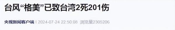 据央视新闻报道,当地灾害应变中心24日晚发布的数据显示,强台风"格美"影响所带来的强风暴雨至今已造成全台湾2死201人受伤,伤者中高雄市56人,台南市32人,台中市27人,花莲县16人及彰化县14人。