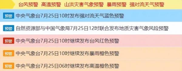 7月25日,中央气象台四预警齐发,包括台风红色预警、暴雨橙色预警、高温橙色预警、强对流天气蓝色预警,水利部、自然资源部分别与中国气象局联合发布橙色山洪灾害气象预警,地质灾害气象风险预警,国家海洋预报台发布,海浪红色警报和风暴潮红色警报,请注意防范。