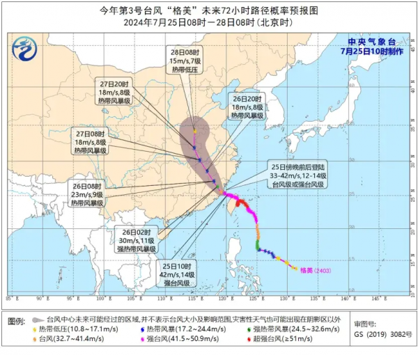 今年第3号台风"格美"已于7月25日0时前后,在台湾省宜兰县南澳乡沿海登陆,登陆时由超强台风级减弱为强台风级。