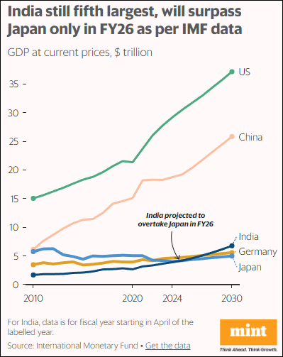 根据IMF的预测,印度目前其实仍为世界第五大经济体,超越日本可能要到2026财年(即2026年3月)实现。 印度财经媒体MINT