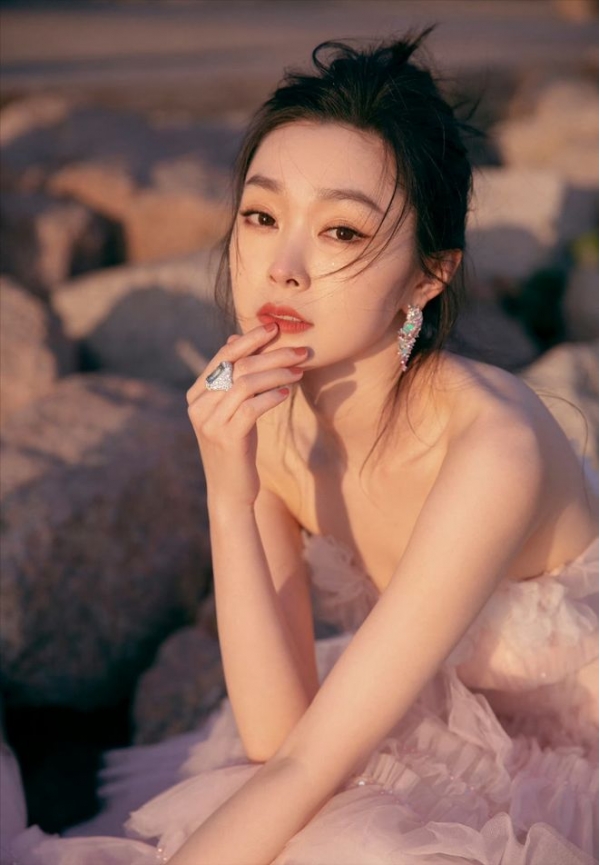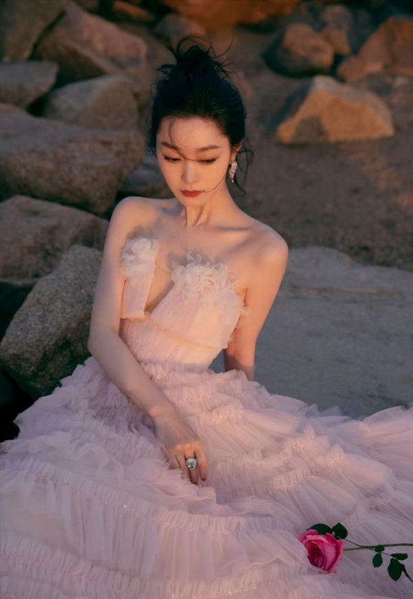 她这一身的粉纱裙,并不是高饱和度的亮粉色,而是低饱和度的淡粉色。这种色调最大的优势就是降低了艳丽感,提升了温柔气质。配合她本身清透的肤色,粉色反而成了提亮肌肤的最佳滤镜。