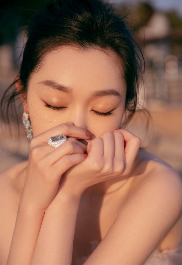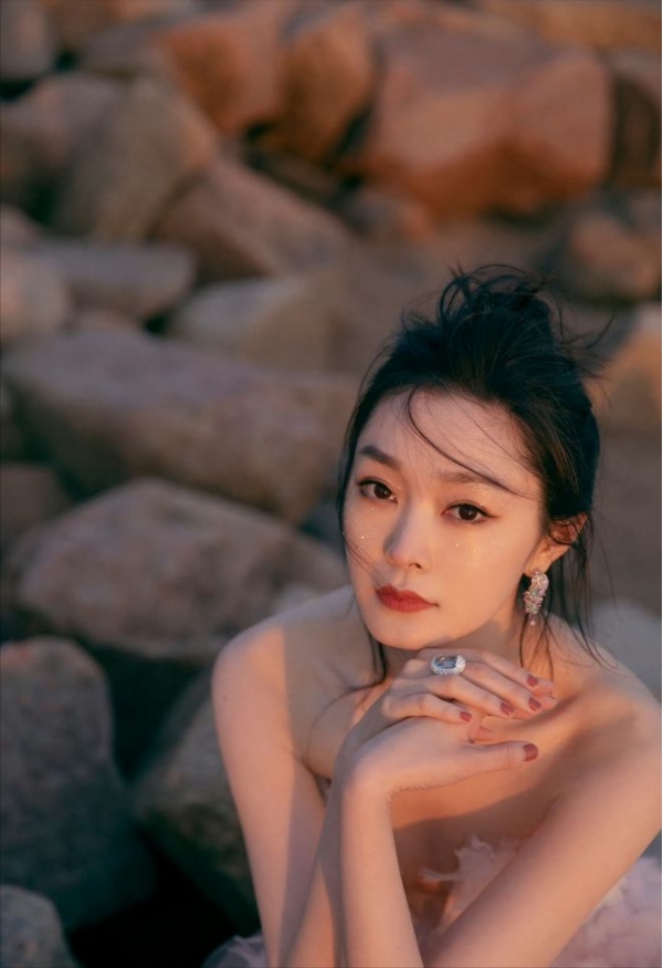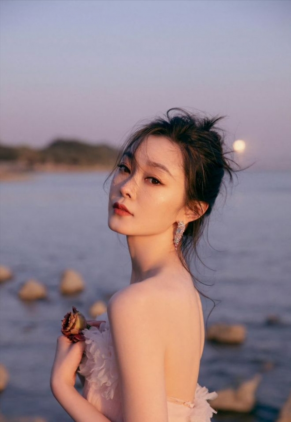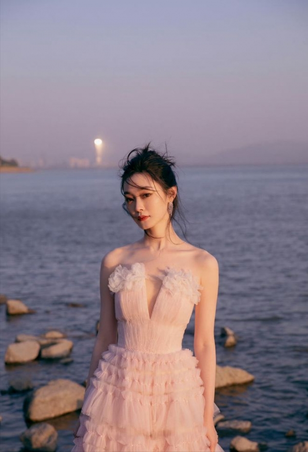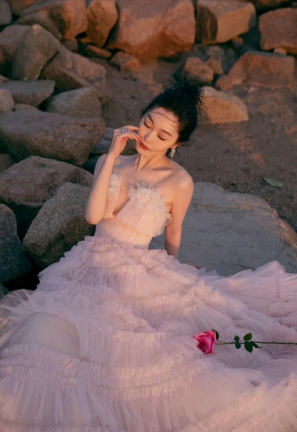 不得不说,宋轶太会选场景了。夕阳的余晖打在粉纱裙上,光影交错,礼服的层叠纱质在光线下更显灵动。海边的岩石与裙摆的轻盈形成反差,让画面自带张力。这种人与环境的呼应,让造型不仅仅是一身礼服,而是一幅完整的画。