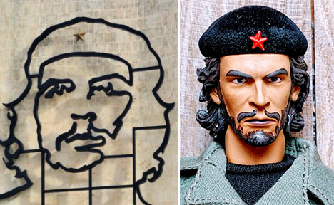 现实中古巴革命广场上的格瓦拉巨幅勾线画像,贝雷帽徽为金星(左);香港公仔爱好者制作的格瓦拉人偶玩具,贝雷帽徽为红星(右)