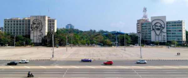 从何塞马蒂纪念碑向北眺望哈瓦那革命广场,西侧为格瓦拉,东侧为西恩富戈斯。