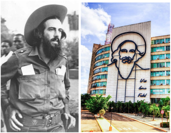 佩戴司令肩章的西恩富戈斯(左)、革命广场东北角通信部大楼的西恩富戈斯塑像(右)。在西恩富戈斯生前的一次演说中,菲德尔在台下插嘴道:"我做得好吗,卡米略?"西恩富戈斯大声答道:"你做得很好,菲德尔!"塑像右下侧的文字就是这句话。