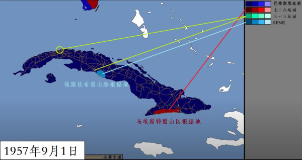 1957年初秋(上)和1958年底(下)的古巴革命形势图。三一三运动的主要活动在大城市地下,东南部唯一的紫色小块是古巴第二大城市--圣地亚哥
