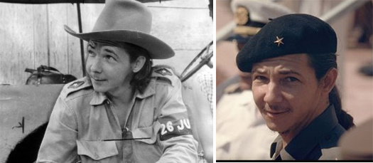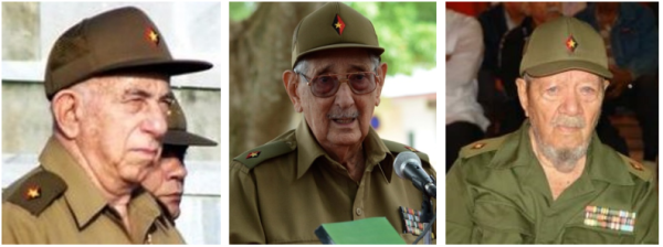 在帽子上佩戴一颗金星司令军衔的马托斯(左);在肩袢上佩戴司令军衔的青年阿梅尔达和菲德尔(右),注意两人肩袢样式不同,阿梅尔达的司令金星缺了规定的红黑底