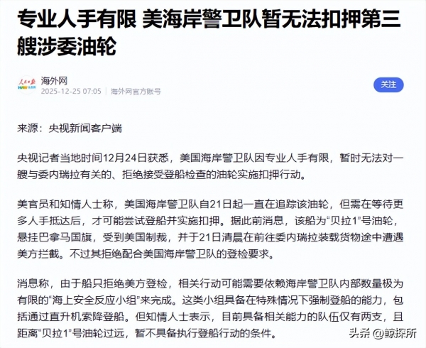 一边是油轮拼命逃窜,一边是美方人手不足,这场追截从一开始就注定了追不上的结局,不少人却不买账,直言这是美国给自己找台阶下。