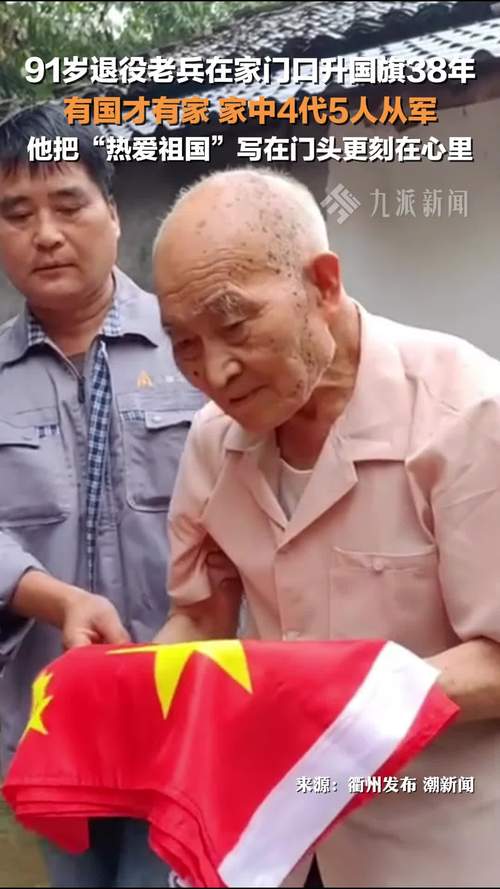 近日,浙江衢州,91岁老兵方大海和妻子每年都会在自家小院升国旗,38年来从未间断。方大海是一位退伍老兵,退伍归家后,请泥瓦匠在新房门头上方写下"热爱祖国"四个大字。他常对家人说,"有国才有家,人倒旗不倒。"