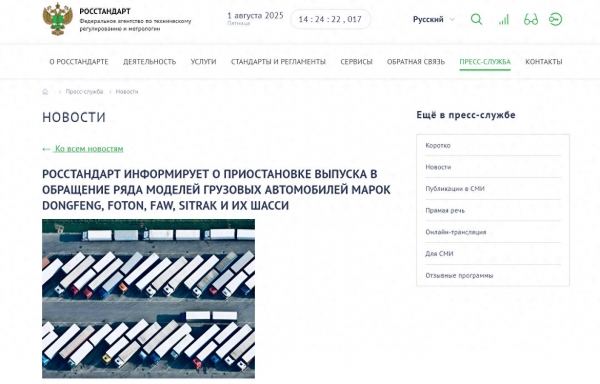 当地时间7月30日,俄罗斯联邦技术监管和计量局宣布,禁止在俄罗斯进口和销售中国东风、福田、解放和重汽汕德卡旗下部分卡车车型。该禁令涉及东风DFH4180、福田BJ4189、解放CA4250和解放CA4180、汕德卡ZZHS,以及福田M4L底盘。俄罗斯联邦技术监管和计量局表示,以上车型被发现违反保障司机和其他行驶人员安全及健康的必需强制性安全要求,如刹车系统能效、行驶汽车声级、车管所检验和紧急呼救设备安装不符合要求等。