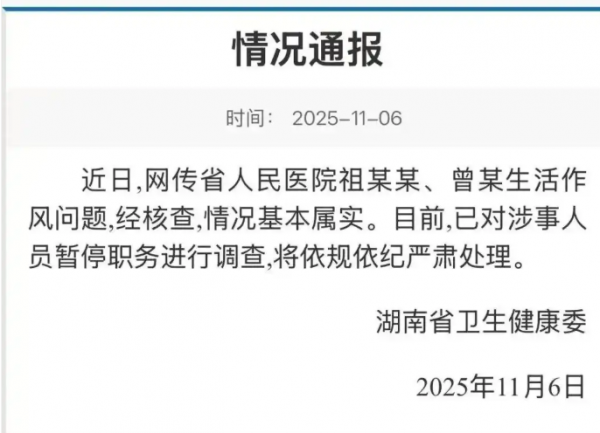 "白大褂里藏私情?"一段17分钟的不雅视频近期引爆网络,湖南省人民医院副院长祖某某与眼科副主任曾某的桃色新闻,随着11月6日卫健委的通报彻底坐实--情况基本属实,两人已被停职调查。这场本该是行业标杆的医疗精英闹剧,为何让全网怒喊"医德不能缺位"?