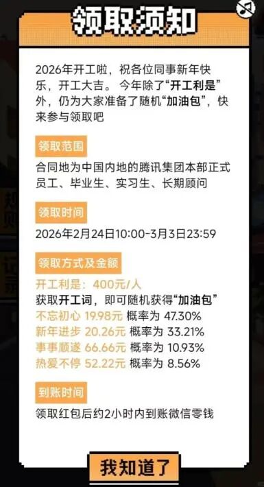 据网友爆料,腾讯除"开工利是"每人400元外,还准备了随机"加油包"。