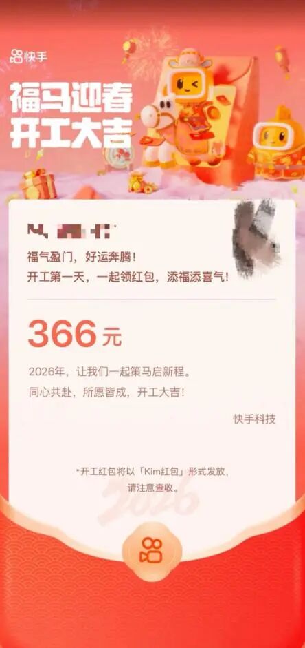 快手给全员发开工红包,据了解正式员工366元,实习生200元。