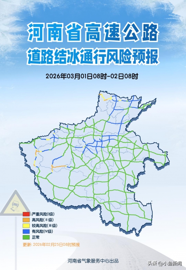 2月底河南降水频繁,公众出行需携带雨具,注意路面湿滑和低能见度对交通安全的不利影响。尤其28日至3月1日高海拔山区局部有道路结冰通行风险,驾车出行请谨慎慢行。