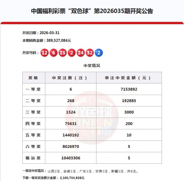 大家好!今天是3月30日,星期二,双色球26035期开奖号码公布了,本期双色球开出的号码为红球:2、6、12、24、25、32蓝球:2。红球开出了1组连号,1组同尾号和0枚重号。