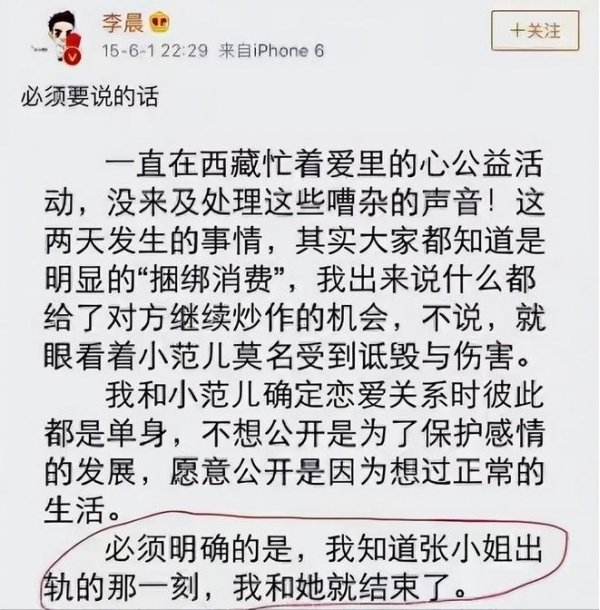 2014 年,李晨公开与范冰冰的恋情后,一句"知道张小姐出轨的那一刻,我和她就结束了",让大家都以为她是"背叛者"。
