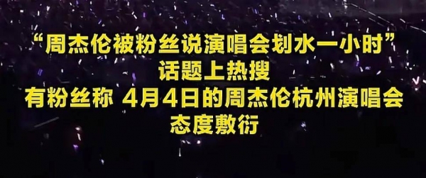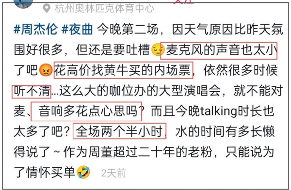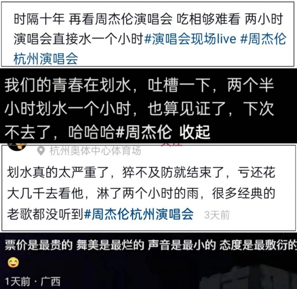 搜索周杰伦划水相关,粉丝的吐槽声音很集中,首先不满的就是演唱会演唱不足,两个小时的时间有一个小时划水;其次舞美音响设备烂,话筒声音小,观众听不太清演唱。而且,周杰伦演唱会溢价严重,黄牛票还没有彻底消失,很多花高价买票淋雨的粉丝都只能认了为情怀买单,但是再没有下次了。
