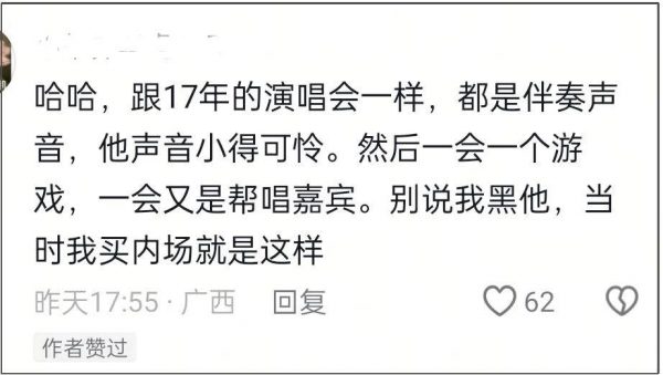 许是吐槽周杰伦话筒声音演唱小的问题太多了,不少粉丝也从情怀中清醒了过来,表示划水是态度问题。
