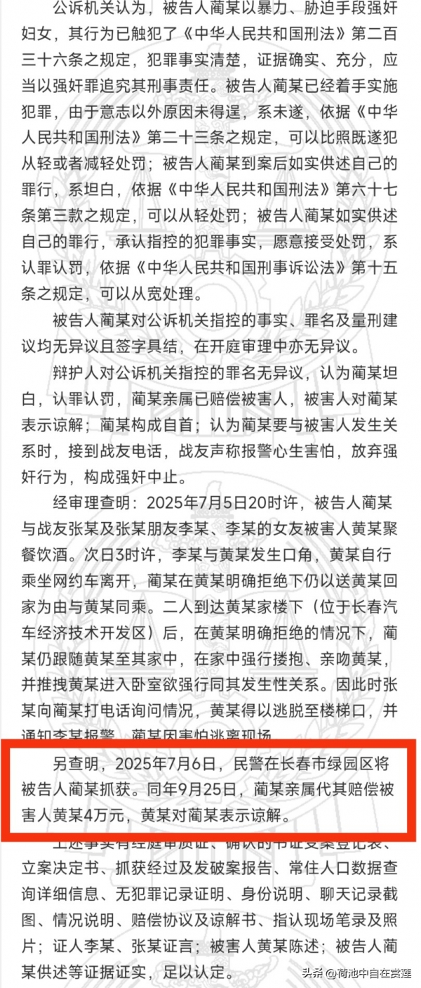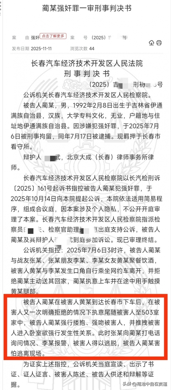 此案后续经长春汽车经济技术开发区人民法院审理,认为被告人蔺某违背了妇女的意志,企图用胁迫等手段强暴黄某。