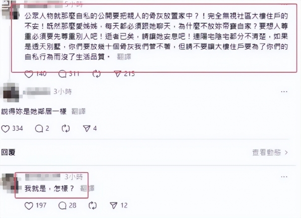 这则消息刚公布,就引来了大S邻居的不满,称小S将大S骨灰放在家中的行为,就是在无视社区大楼住户的不安。让阳宅成了阴宅,还反问小S如果真的那么爱她姐姐,干嘛不把骨灰放到自己家。
