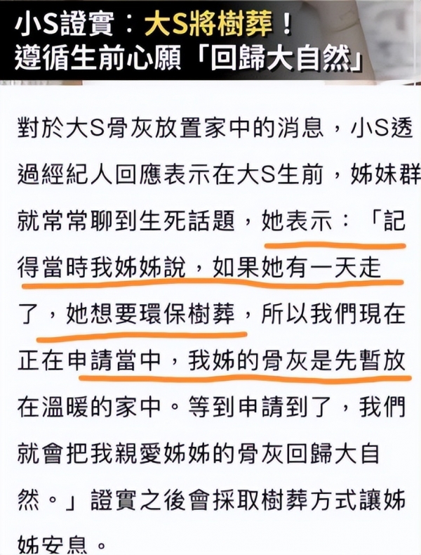 前几日,在大S的骨灰接回台湾后,小S就发布了一则声明,称"不会将大S下葬,要放在家中,好方便人来陪伴她"。