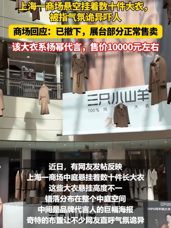这事儿是三只小山羊品牌搞的开业宣传,他们在四楼开新店想整点创意吸引人,设计师脑子一热说咱把大衣吊起来展示,显得高级有艺术感,品牌方一听说行就这么办。