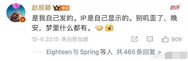 作为当事人的赵丽颖看不下去了,直接在社交媒体发文维护工作室:"是我自己发的。IP是自己显示的。别叽歪了,晚安,梦里什么都有。"