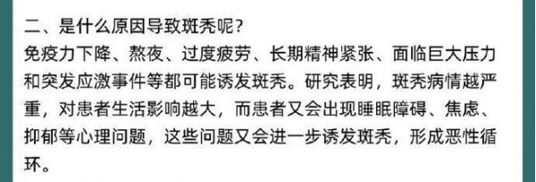 于是张馨予就在网络上大致查了一下"导致斑秃"的原因,像什么熬夜、过度疲劳、长期精神紧张、生活压力大等等都会诱发斑秃。