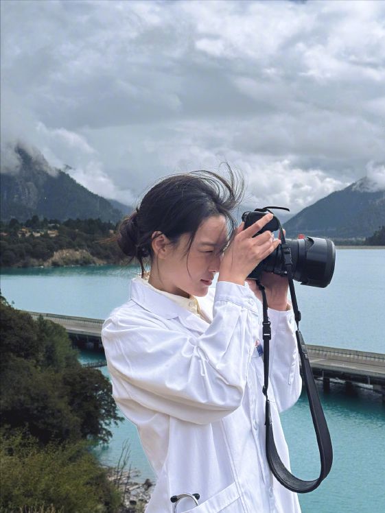 后面张馨予还放出了新角色"苏医生"的剧照,身穿白大褂站在湖边拿着相机拍照。