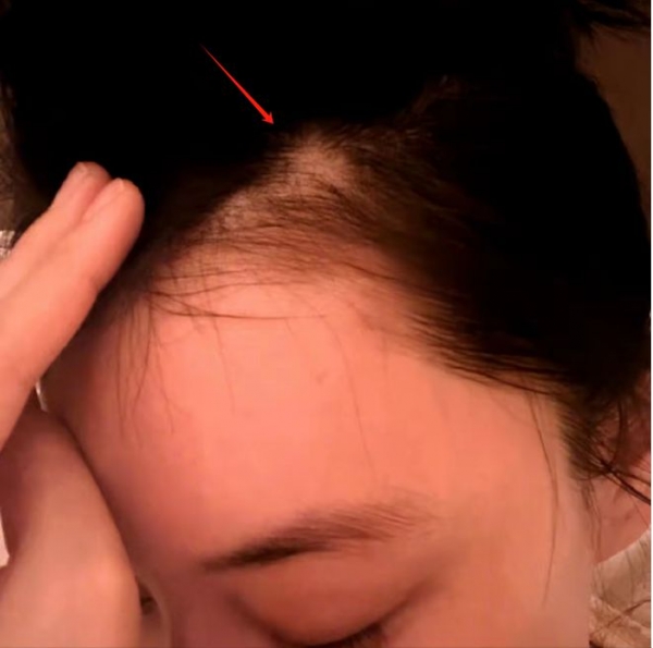 只见这张照片中,可以清楚地看到张馨予把头发一掀开,距离发际线的位置有一块秃了。