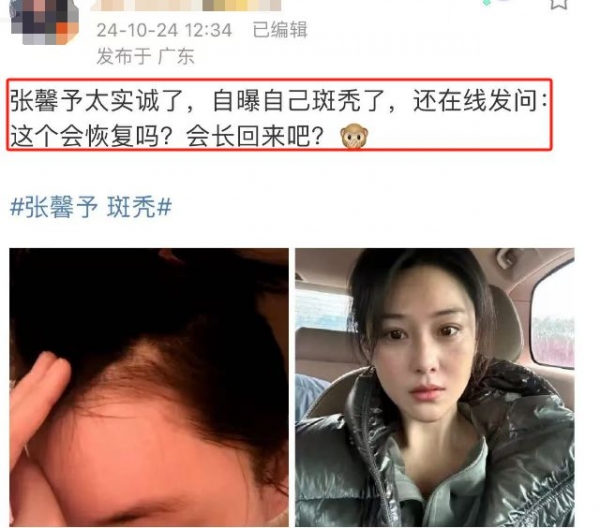 10月24日,女演员张馨予在个人平台发布了一组照片,主要内容是突然有一天发现自己"斑秃"了。