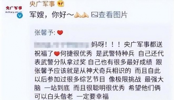 就连央广军事的官微也转发了张馨予官宣的文案,配文:"军嫂,你好。"