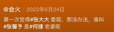 网友看后辣评:"第一次觉得张大大委屈,那没办法,谁让张馨予是何捷老婆呢!"