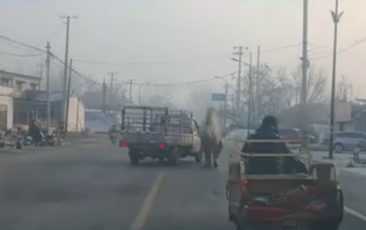 近日,山东菏泽,一骆驼出逃在道路上狂奔,主人开车赶回来了。