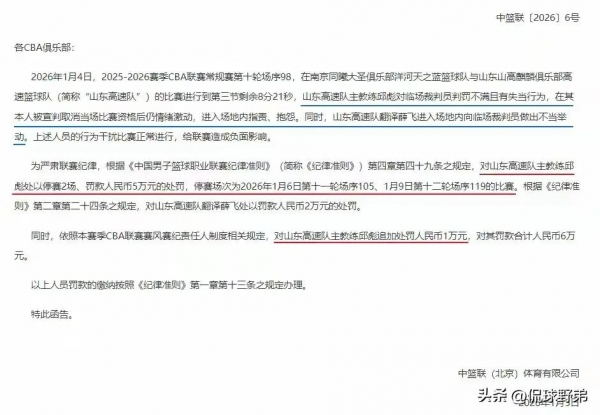 北京时间1月5日,CBA开出了罚单,这份罚单是对山东男篮主教练邱彪,以及山东男篮翻译薛飞两个人的处罚。而且这份处罚对山东男篮来讲,带来了较大的影响。接下来的比赛,山东男篮要做好最坏的打算。